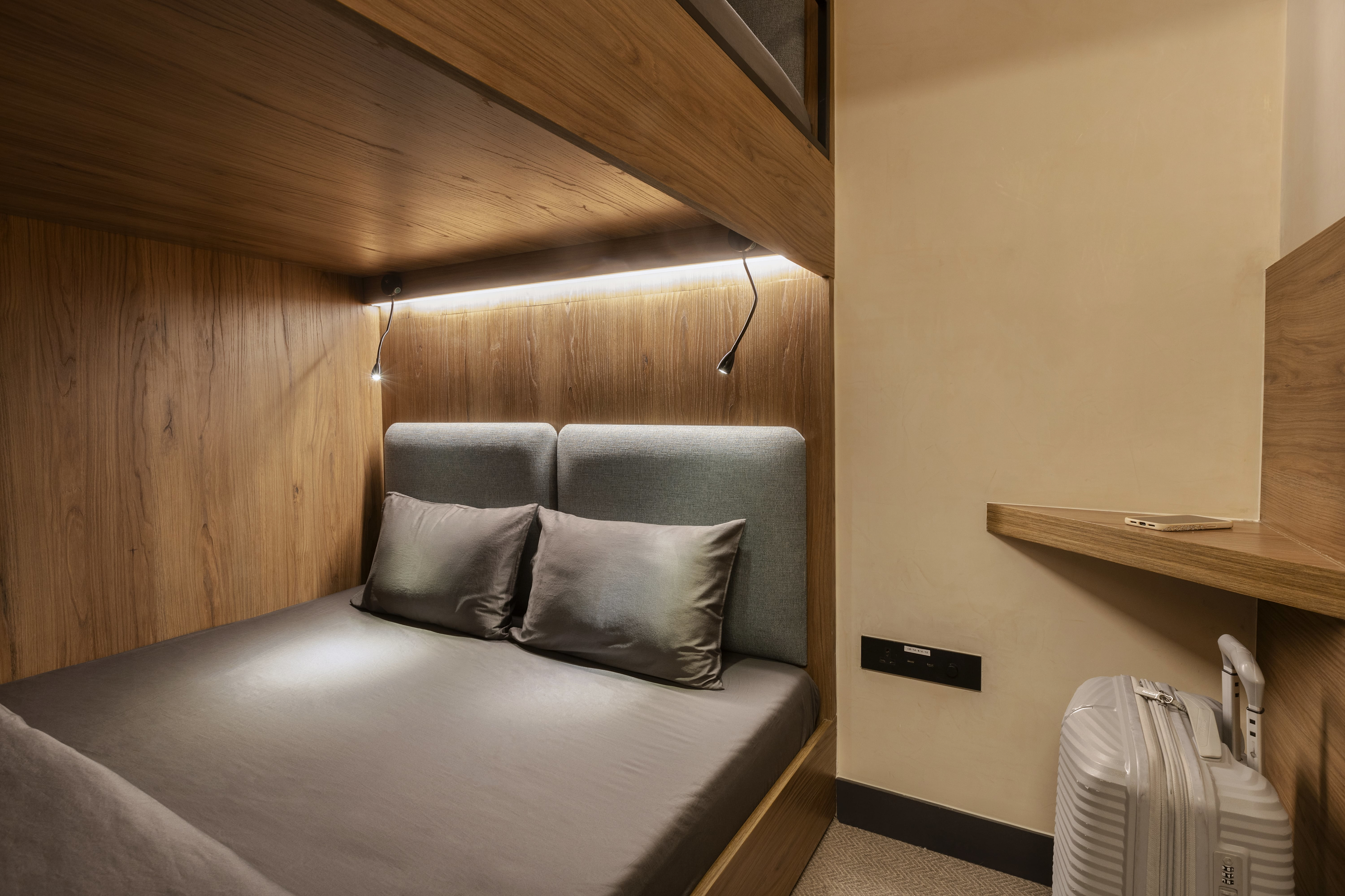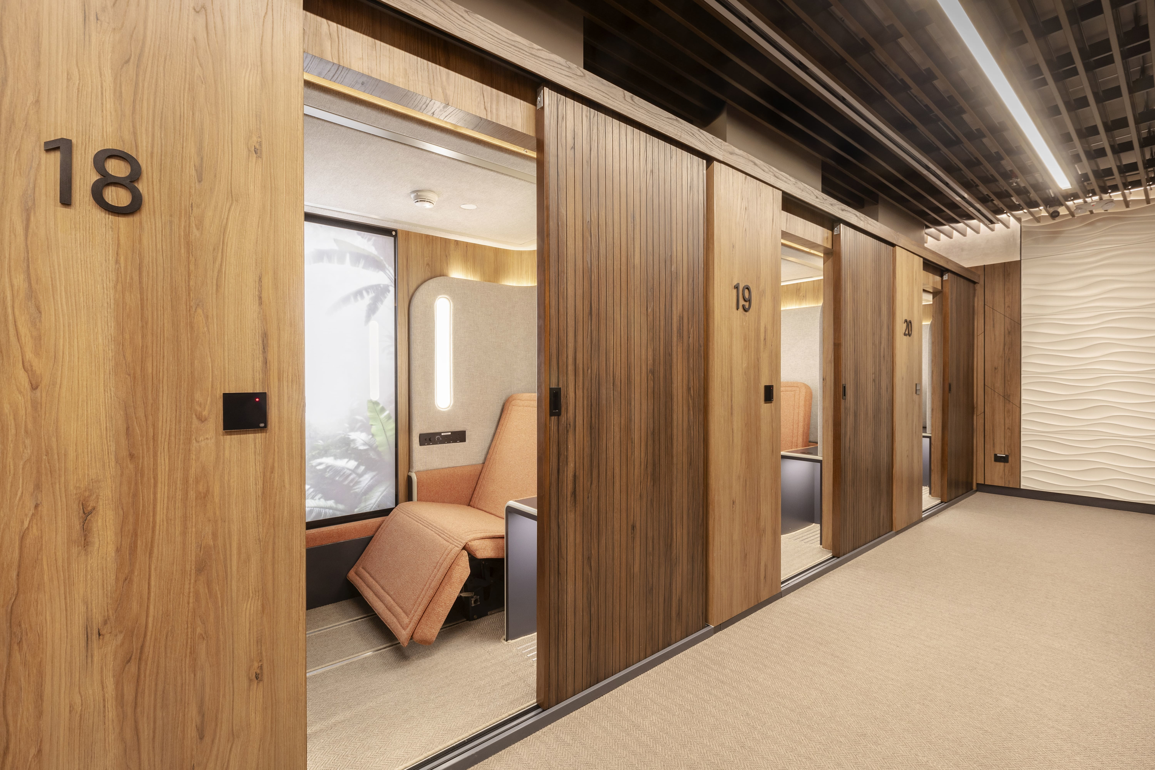 - Fully equipped FlexiSuites featuring zero-gravity recliners inspired by Business Class airline standards, complete with modern ergonomic design, a calming light installation, wireless charging, pop-up plug sockets, and convenient storage compartments